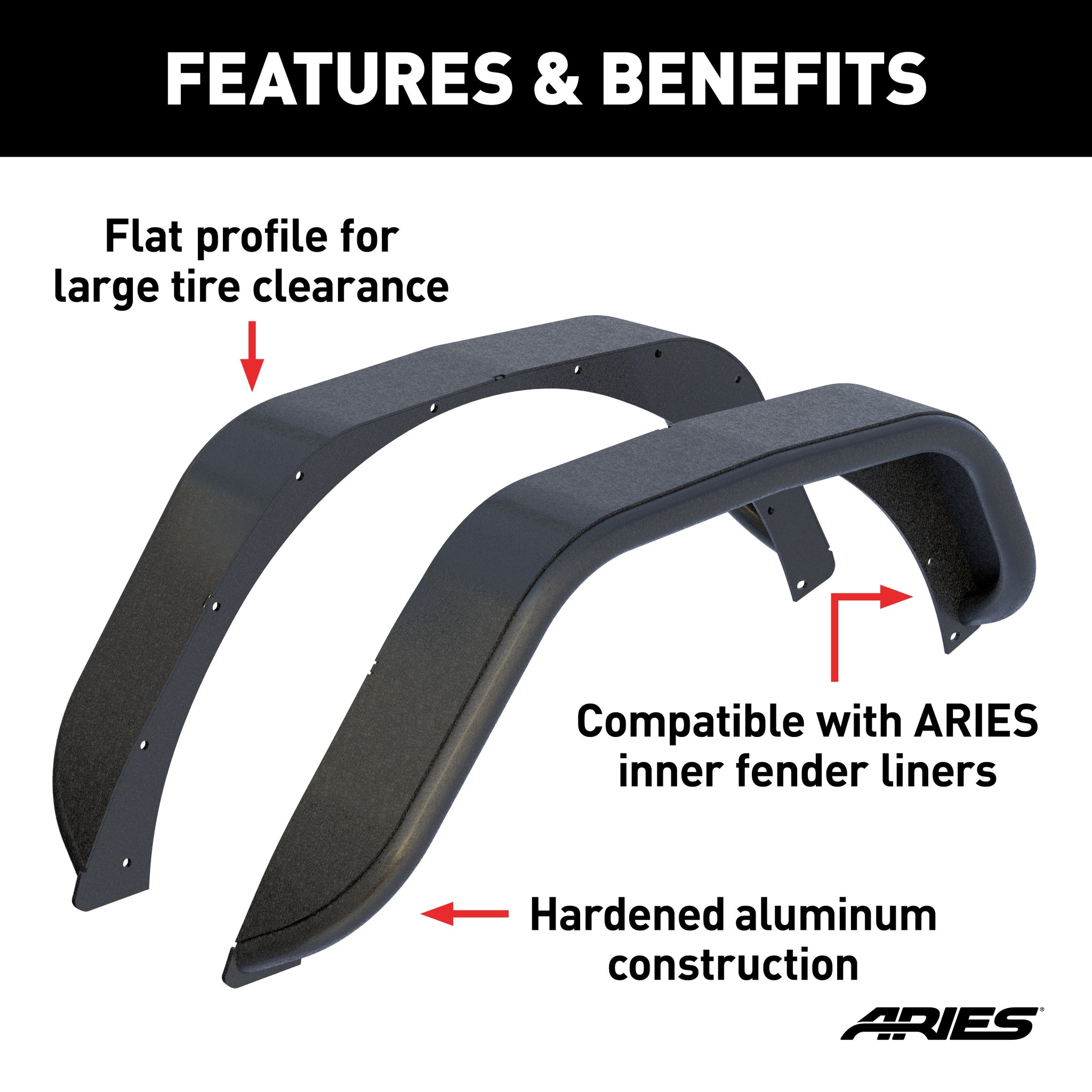 ARIES Jeep fender flares add style and offroad readiness to your Jeep Wrangler JL, featuring rust-free aluminum construction, custom-fit contours and a narrower width to show off larger, offroad tires. Hardened, T6 aluminum alloy construction allows these fender flares to be strong, lightweight and rust-free. To maximum corrosion resistance, they are also covered in a unique textured black powder coat finish that helps hide minor scratches and grime accumulated on the trail. They are also available in paintable, raw aluminum for added customization. ARIES Jeep fender flares are designed to replace the Jeep factory fender flares to better accent larger tires on offroad-style Wranglers. The narrowed width gives them a sleek, trail-ready look, while still maintaining excellent functionality. ARIES Jeep fender flares also feature a vehicle-specific contour to offer a precise fit and added style. ARIES fender flares come with all necessary mounting hardware for a complete installation and are sold in pairs for the front or rear (some drilling may be required).