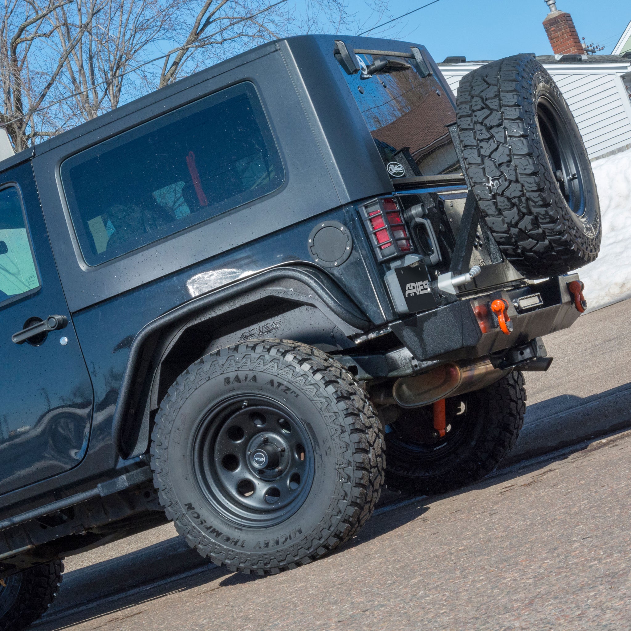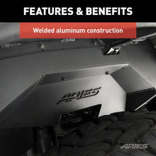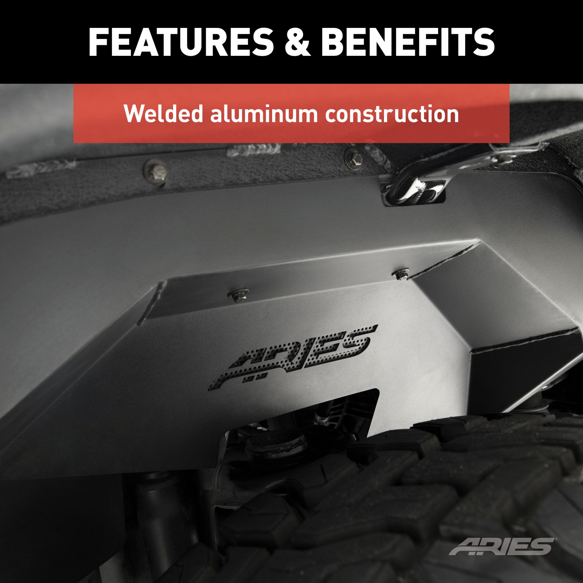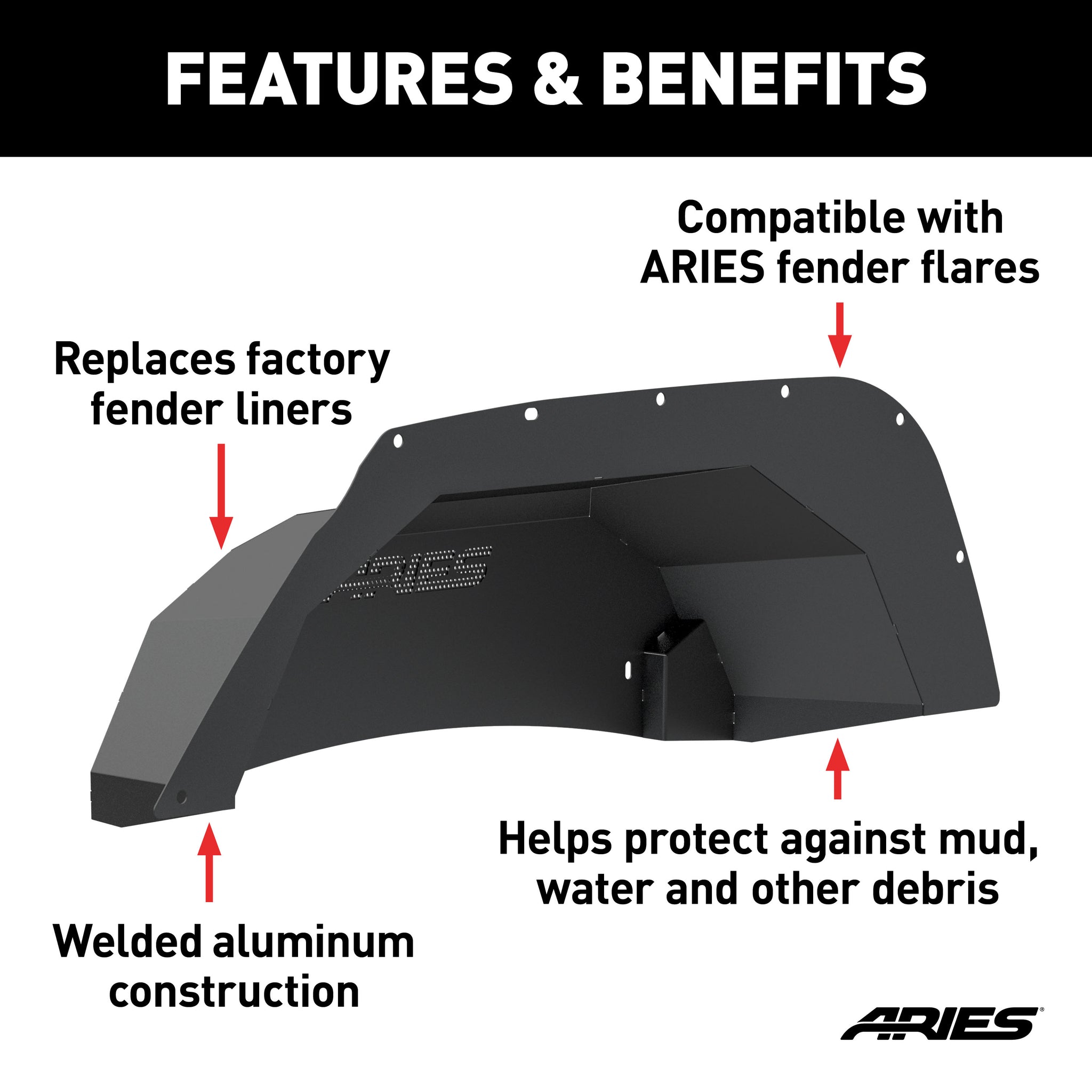 For those who eat, sleep and breathe off-roading, ARIES fender flares show off your off-road tires better than factory flares, and they feature strong, lightweight aluminum construction to easily stand up to the elements. These rear inner fender liners are designed to mount with ARIES Jeep JK fender flares #1500201 and provide ultimate protection against mud, water and road debris. ARIES Jeep inner fender liners are constructed from welded aluminum to not only be lightweight and rust-free, but also to offer better strength than the plastic factory fender liners. They are also covered in a highly durable carbide black powder coat finish for maximum corrosion protection. ARIES rear fender liners install securely in conjunction with ARIES fender flares and include all necessary hardware for a complete installation (some drilling and rivet nut installation required). Jeep fender liners are also available for the front or in a complete kit for the front and rear.