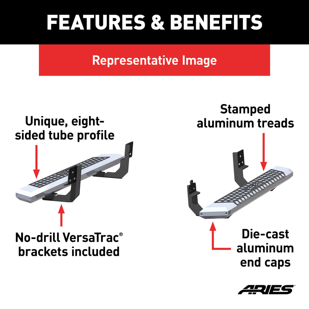 ARIES AdvantEDGE side bars do away with the common, rounded look of other side bars, nerf bars and running boards, featuring an angular, eight-sided tube profile and powder-coated all-aluminum construction. The angular edges provide a clear-cut, uncompromising accent for the look of today's trucks. Made from 5-1/2" wide, eight-sided, extruded aluminum tubing, AdvantEDGE running boards are strong, lightweight and impervious to rust, offering a solid step that is built to face the elements and outlast them. They also come with die-cast aluminum end caps and a stamped aluminum tread. The aluminum treads provide a long-lasting, non-skid stepping surface that will not crack or fade in the sun. ARIES AdvantEDGE side bars are also marked for their easy, custom-fit installation. They feature the ARIES VersaTrac mounting system with brackets that are made from powder-coated steel and built for specific vehicles. This particular set of custom running boards fits specific years of the Ford F150 (see application info to verify compatibility). The high-strength steel brackets mount using pre-existing holes, and the aluminum running boards attach to the brackets with heavy-duty hardware. The VersaTrac mounting system makes installation simple and customizable, allowing the side bars to be swapped out at any time with other side steps or running boards that use the VersaTrac system. Setting yourself apart is simple with the ARIES AdvantEDGE series. In addition to these truck side steps, we also offer the AdvantEDGE bull bar and AdvantEDGE headache rack, featuring the same all-aluminum construction and eight-sided tube profile. For a fully customized look to match your pickup, AdvantEDGE side bars are available in two finish options, including carbide black powder coat and chrome powder coat.