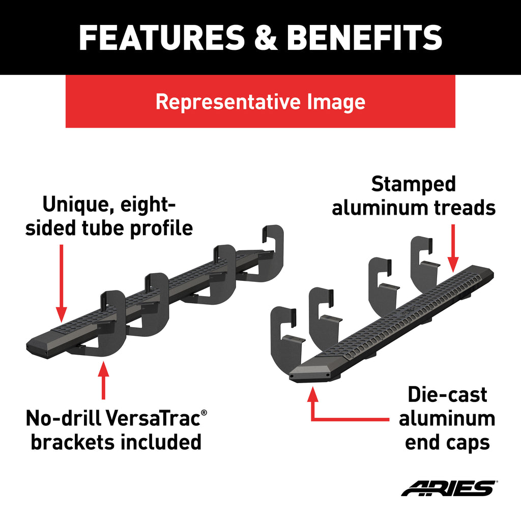 ARIES AdvantEDGE side bars do away with the common, rounded look of other side bars, nerf bars and running boards, featuring an angular, eight-sided tube profile and powder-coated all-aluminum construction. The angular edges provide a clear-cut, uncompromising accent for the look of today's trucks. Made from 5-1/2" wide, eight-sided, extruded aluminum tubing, AdvantEDGE running boards are strong, lightweight and impervious to rust, offering a solid step that is built to face the elements and outlast them. They also come with die-cast aluminum end caps and a stamped aluminum tread. The aluminum treads provide a long-lasting, non-skid stepping surface that will not crack or fade in the sun. ARIES AdvantEDGE side bars are also marked for their easy, custom-fit installation. They feature the ARIES VersaTrac mounting system with brackets that are made from powder-coated steel and built for specific vehicles. This particular set of custom running boards fits specific years of the Ram 2500 and 3500 (see application info to verify compatibility). The high-strength steel brackets mount using pre-existing holes, and the aluminum running boards attach to the brackets with heavy-duty hardware. The VersaTrac mounting system makes installation simple and customizable, allowing the side bars to be swapped out at any time with other side steps or running boards that use the VersaTrac system. Setting yourself apart is simple with the ARIES AdvantEDGE series. In addition to these truck side steps, we also offer the AdvantEDGE bull bar and AdvantEDGE headache rack, featuring the same all-aluminum construction and eight-sided tube profile. For a fully customized look to match your pickup, AdvantEDGE side bars are available in two finish options, including carbide black powder coat and chrome powder coat.