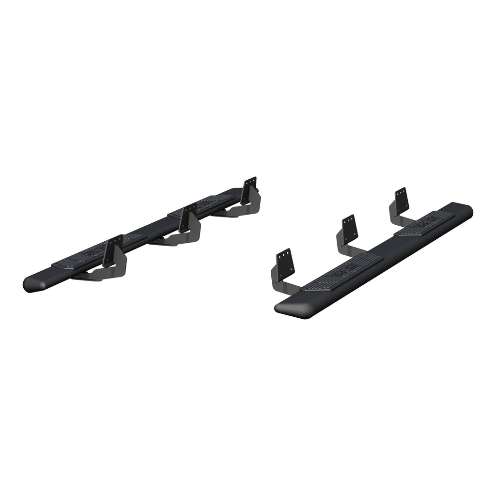 ARIES AscentSteps are truly modern running boards for today's trucks and SUVs. They feature an elegant teardrop profile, highly unique dual-constructed step pads, a rigid and rust-resistant build and a no-drill installation. AscentStep running boards are set apart from other, common oval side steps with their stylish, distinctive teardrop shape. The boards are rounded on the ends with seamlessly blended end caps, giving them subtle, superior style to complement your truck. The step pads of these running boards are also unique, featuring a two-part construction. They are comprised of a polyethylene tread base and a metal plate overlay. The poly treads protrude through the overlay, providing an aggressive accent and non-skid traction for a safe stepping surface. The stainless steel plates also help protect the running boards from scuffs, scratches and rust caused by frequent foot traffic. AscentStep running boards offer excellent rigidity with their high-strength steel construction. The steel is covered with a durable carbide black powder coat finish for dependable corrosion, scratch and UV resistance and for a clean, sleek look on your truck or SUV. Every set of ARIES AscentStep running boards is made for vehicle-specific application. This ensures optimal integration with the truck without any drilling or difficult modifications required. This particular set of custom running boards fits certain years of the Ram 1500 crew cab (see application info to verify fitment). Additionally, AscentSteps are equipped with the VersaTrac system, meaning once the brackets are installed, they can accept other running boards or side steps with the VersaTrac system. This makes installation and customization easy.