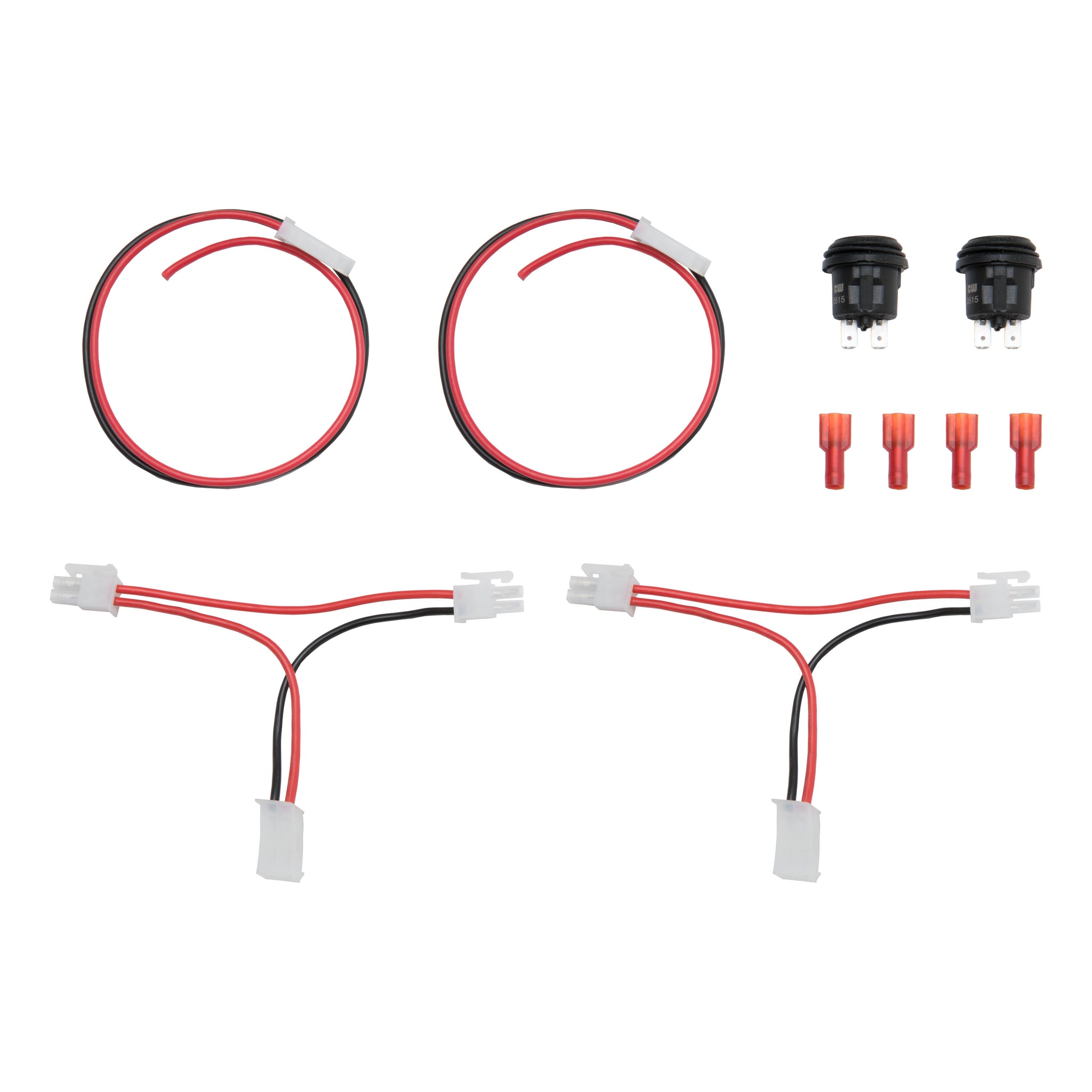 - Includes two wiring harnesses, two push-button switches and four connectors