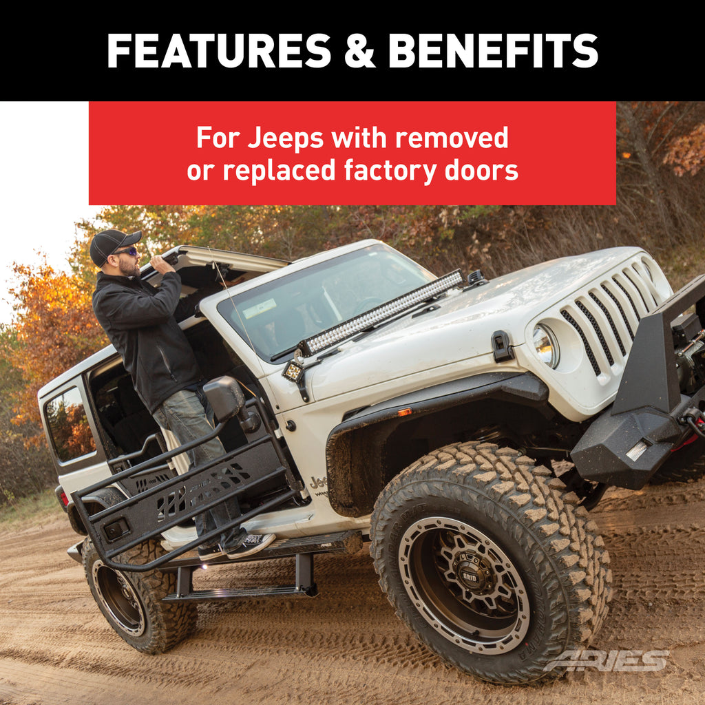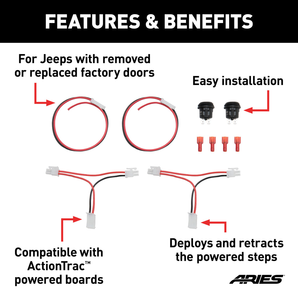 ARIES ActionTrac powered running boards are an innovative step in truck accessories. These electric side steps are unique from other power side steps because they are actually two steps in one. This step-within-a-step design -- combined with a no-drill installation, smart-sensor operation and powder-coated aluminum construction -- truly makes these retractable running boards an asset for the offroad truck or Jeep Wrangler, particularly as lifted truck steps. This door delete kit is intended to be mounted on a Jeep Wrangler with the factory doors removed or replaced with aftermarket doors. It includes two switches that allow the powered steps to be deployed and retracted at the push of a button. NOTE: Use of these switches requires manual operation of the running boards. Failure to retract the boards when operating the vehicle could result in damage to the boards or vehicle.