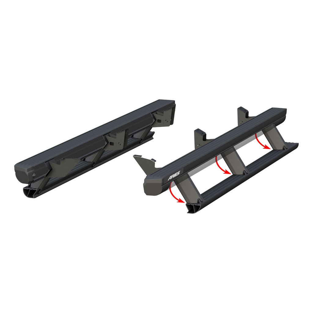 ARIES ActionTrac powered running boards are unique from other power side steps because they are actually two steps in one. This patented step-within-a-step design -- combined with a no-drill bracket installation, control module operation and powder-coated aluminum construction -- truly makes these retractable running boards an asset for the offroad truck or Jeep, particularly as lifted truck steps. ActionTrac powered running boards have one 4" wide step on top of the main housing and one 3" wide that automatically deploys as needed. When the door opens, the control module deploys the power step 8" below the main step, 15" below the doorsill, depending on the model. This two-step design offers enhanced safety and easier vehicle entry and exit, especially on large, lifted vehicles. It's also very helpful for families with young children and for elderly passengers. The boards contour to the vehicle and offer extra protection for the rocker panels from small road debris. For additional safety, the module is able to detect any obstructions during operation to avoid pinch hazards. LED lights are also built into the housing to illuminate the steps when deployed. ARIES ActionTrac powered running boards are made for vehicle-specific installation for a custom fit. They use pre-existing factory holes for the brackets to eliminate drilling. They also do not require any splicing into factory wiring. These particular running boards fit specific years of the Toyota Tacoma (see application info to verify fitment). Each set is constructed from powder-coated aluminum to be strong, lightweight and non-corrosive. The quiet, maintenance-free rotary motor is shielded within the main housing, along with the power step pivot points and all electrical components, protecting them from the harsh elements. NOTE: Boards, brackets and wiring are included.
