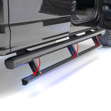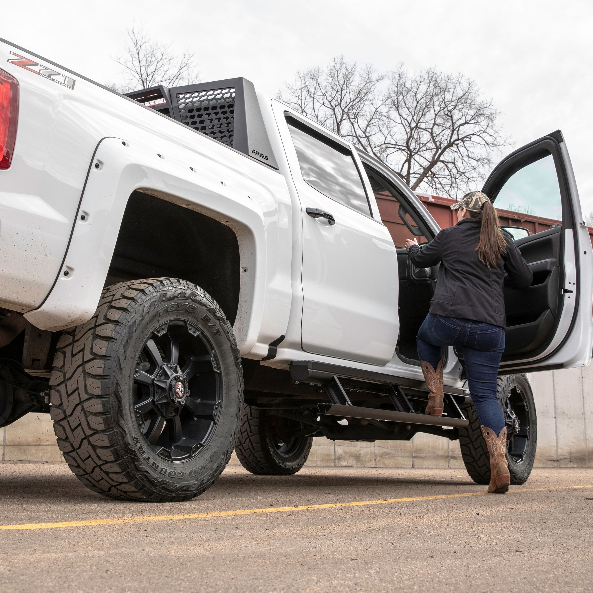 ARIES ActionTrac powered running boards are unique from other power side steps because they are actually two steps in one. This patented step-within-a-step technology -- combined with a no-drill bracket installation, control module operation and powder-coated aluminum construction -- truly makes these retractable running boards an asset for the offroad truck or Jeep, particularly as lifted truck steps. ActionTrac motorized running boards have one 4" wide step on top of the main housing and one 3" wide that automatically deploys as needed. When the door opens, the control module deploys the power step 8" below the main step, 15" below the doorsill, depending on the model. This two-step design offers enhanced safety and easier vehicle entry and exit, especially on large, lifted vehicles. It's also very helpful for families with young children and for elderly passengers. The boards contour to the vehicle and offer extra protection for the rocker panels from small road debris. For additional safety, the module is able to detect any obstructions during operation to avoid pinch hazards. LED lights are also built into the housing to illuminate the steps when deployed. ARIES ActionTrac automatic running boards are made for vehicle-specific installation for a custom fit. They use pre-existing factory holes for the brackets to eliminate drilling. They also do not require any splicing into original factory wiring. These particular automotive running boards fit specific years of the Chevrolet Silverado and GMC Sierra 1500, 2500 HD or 3500 HD crew cab (see application info to verify fitment). Each set is constructed from powder-coated aluminum to be strong, lightweight and non-corrosive. The quiet, maintenance-free rotary motor is shielded within the main housing, along with the powerboard pivot points and all electrical components, protecting them from the harsh elements. NOTE: Boards, brackets and wiring are included.
