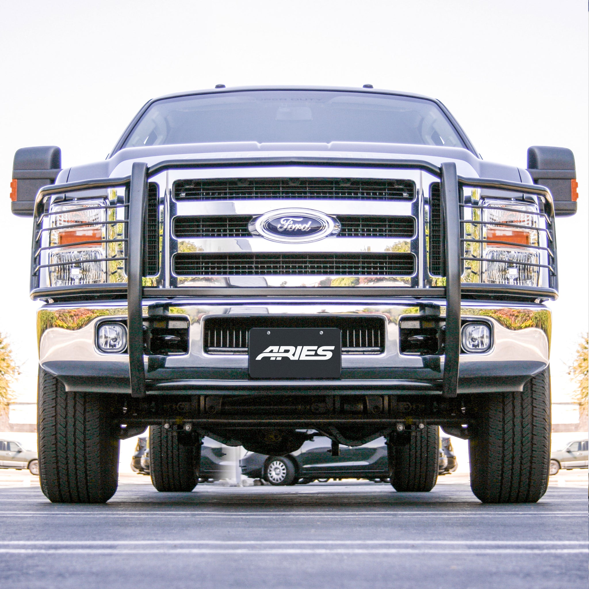 For the conqueror in every truck, Jeep or SUV owner, the ARIES grille guard offers the tough, trail-ready look you demand. It begins with a one-piece frame of 1/4" thick welded plates and 1-1/2" mandrel-bent tubing for a solid build. Each one is made with a vehicle-specific design for a better fit, easier install and more secure mounting. The side brush guards are custom-bent to contour to the profile of your vehicle, while the mounting brackets are positioned for a no-drill application. This means pre-existing factory holes are used to ensure optimum fitment and less vibration. This particular custom grille guard fits specific years of the Ford F250 Super Duty, F350 Super Duty, F450 Super Duty and F550 Super Duty (see application info to verify). The ARIES grille guard also makes it easy to customize the look of your vehicle. Not only does the crossbar have two pre-drilled holes for mounting aftermarket LED lights, but many of our grille guards are also available in two finish options -- polished stainless steel or semi-gloss black steel. The stainless steel grille guard is made with 304 stainless, being high in nickel content and truly resistant to rust and corrosion. This option comes with a mirror-like polished finish for a definitive shine. The semi-gloss black grille guard is made with high-strength carbon steel for added strength. It features a tough, dual-layer E-coat and black powder coat finish to protect against rust, scratches and the elements. All ARIES grille guards also come with rubber stripping along the risers to protect the frame against scuffs and scratches.