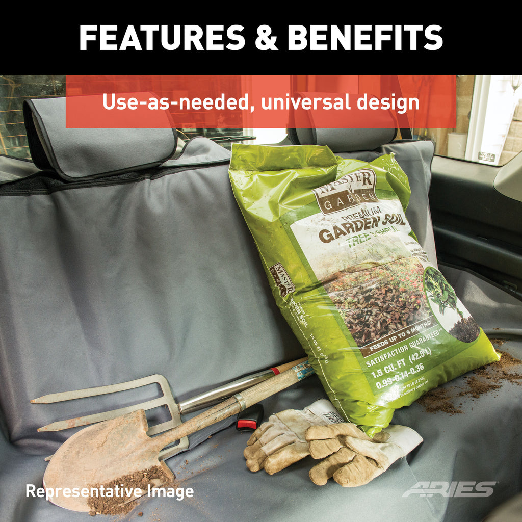 The ARIES Seat Defender is a universal, use-as-needed seat protection system that readily installs whenever you need it. It provides an instant defense against dirt, spills, pet dander and any other threats to your vehicle's interior. What makes it unique is its use-as-needed design. Rather than being a permanent cover-up for unsightly interior that has already been damaged, the Seat Defender acts as a barrier to prevent the damage before it happens. Unlike seat covers that require tedious installation, the Seat Defender is designed to be easy to put on and take off, whenever needed. It attaches securely to the headrest and conforms to the shape of the seat, giving the seat a tough, waterproof outer layer. The ARIES Seat Defender is also easy to store and keep clean. Because it is not a permanent seat cover, it is designed for fast cleanup, fast foldup and fast installation the next time you need it. It easily protects against wet clothes, dirty tools, muddy sports equipment, shedding pets, sandy swimsuits, messy fast food and more. It is also 100% machine washable and can be stored in any small compartment in your vehicle. The ARIES Seat Defender is made out of a two-sided material to provide a sophisticated barrier against potential threats. The underside is a layer of water-resistant thermoplastic rubber (TPR). TPR is durable and wear-resistant and provides added comfort and safety by gripping the surface of the seat. The top side is a woven 600-denier terylene fabric that keeps dirt and spills out and maintains comfort for the user. The ARIES Seat Defender is perfect for pet owners, outdoor enthusiasts, soccer moms, industrial and commercial workers, frequenters of the beach or boat landing and many others.