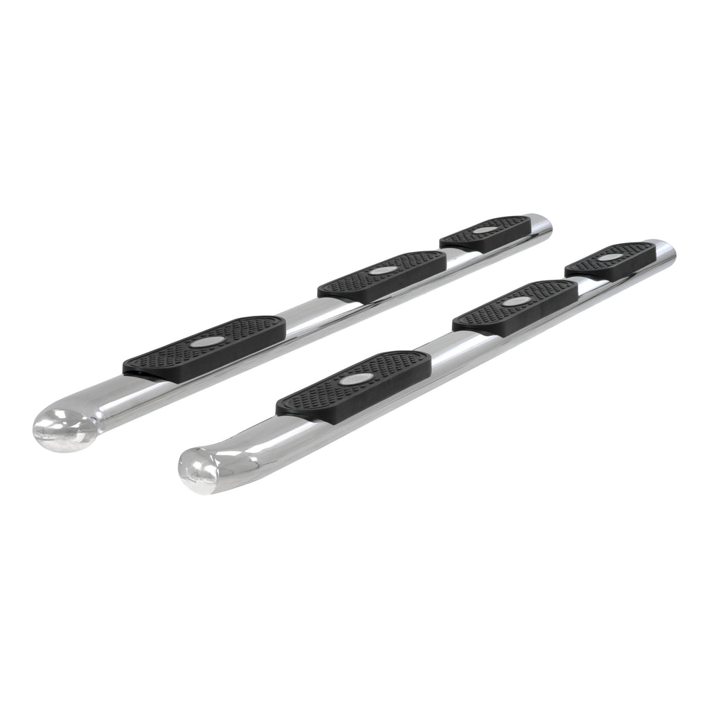 When you start and end your day turning the ignition of your truck, unreliable footing just is not an option. You need a step that can bear weight with ease, provide comfortable footing and look good doing it. ARIES 4" oval side bars are sleek, strong and custom-fitted to be a highly functional extension of your truck. For a variety of makes and models, 4" oval sides are a step up. ARIES 4" oval side bars are made with strong 4" elliptical tubing and are available in two different finish options to allow you full customization: polished stainless steel and black powder coat carbon steel. These 4" oval sides are a special wheel-to-wheel side bar option, featuring 304 stainless steel construction to be truly rust-resistant and a polished finish for a mirror-like shine. They are fitted with an extra step pad and are made to span the length of your truck's wheelbase for utility purposes and an enhanced appearance. The extended step of our wheel-to-wheel side bars allows for a sturdy foothold and easy access to the truck bed. Something that sets the ARIES 4" oval side bar apart from all others is its blended end caps and OE-style bends. Rather than capping our side bars with a plastic cap, we offer a blended end cap for a smooth, finished appearance. ARIES 4" oval side bars are also fitted with raised step pads to provide a wide stepping surface. The polypropylene construction will not crack over time, and because it has a textured grip, the surface is highly resistant to slips and skids, even when wet. Installation of these ARIES 4" oval wheel-to-wheel side bars is quick and easy with custom-fitted mounting brackets and no drilling necessary.