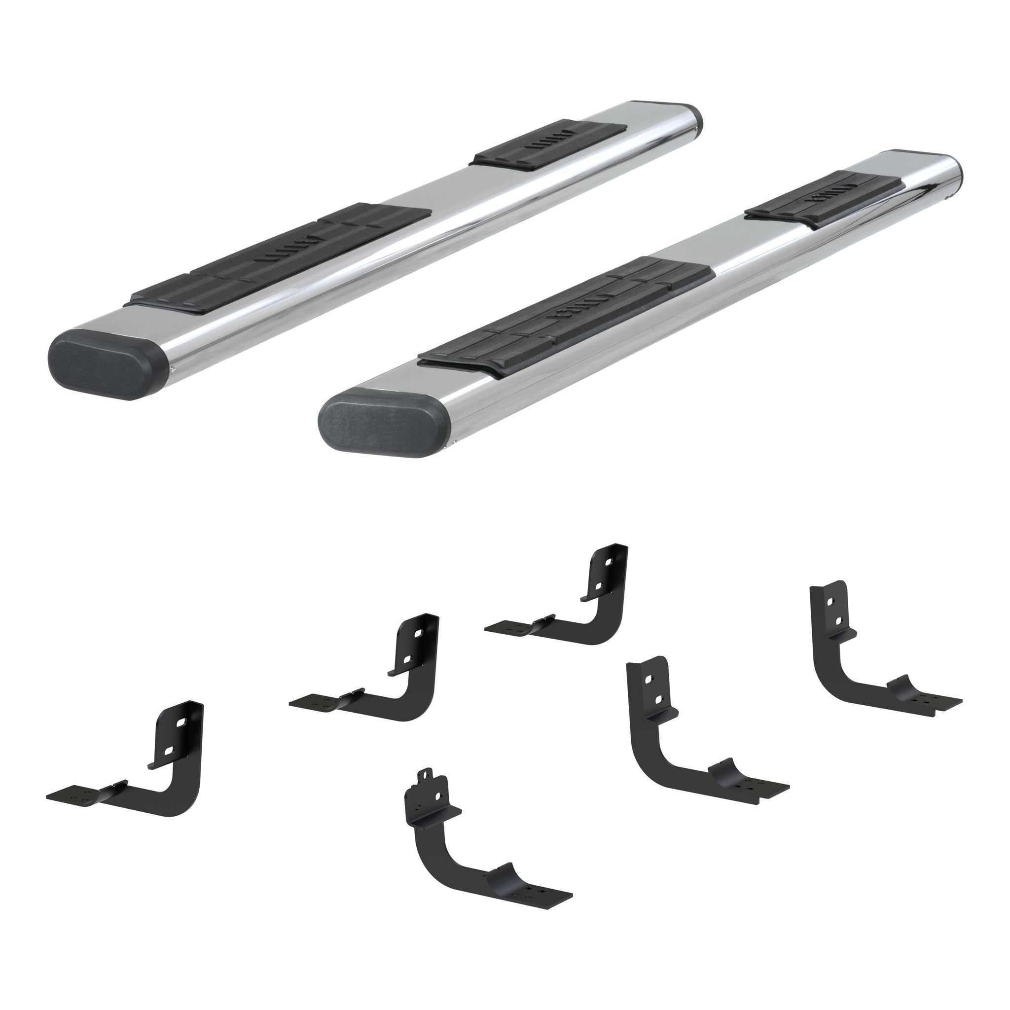 For solid footing, a comfortable step and a bold look for your truck, ARIES 6" oval side bars are a step up. They are designed to mimic the style of popular original equipment side bars and running boards, featuring two professional finish options, large non-skid step pads and tapered end caps. This particular pair of 6" ovals is made with 304 stainless steel, meaning they are high in nickel content to be truly resistant to rust and corrosion. For a lasting shine and a bright accent on your vehicle, they are given a highly polished, mirror-like finish. They are also available in semi-gloss black powder-coated aluminum. To protect the interior of the tubes, all 6" oval sides are equipped with hard ABS plastic end caps. The end caps come pre-attached to the tubes and feature a tapered design, lending to the overall OE look of the side bars and providing a professional finishing touch on your truck or SUV. For a sure step every time you climb into your vehicle, ARIES 6" ovals are equipped with extra-wide step pads. The step pads are made from tough polypropylene and provide a generous 5" width. The large, flat surface offers comfortable footing and has a textured surface to prevent slipping, even when wet. The polypropylene construction makes the step pads durable and crack-resistant for long-lasting use. ARIES 6" oval side bars are also made for easy, no-drill installation. The boards themselves feature a track system for versatile application, and they mount using vehicle-specific brackets for a custom fit on certain years of the Ram 2500 or 3500 and Dodge Ram 2500 or 3500 (see application info to verify fitment). The mounting brackets are made from high-strength carbon steel and use pre-existing holes to eliminate drilling during the installation process.