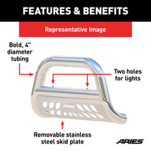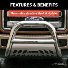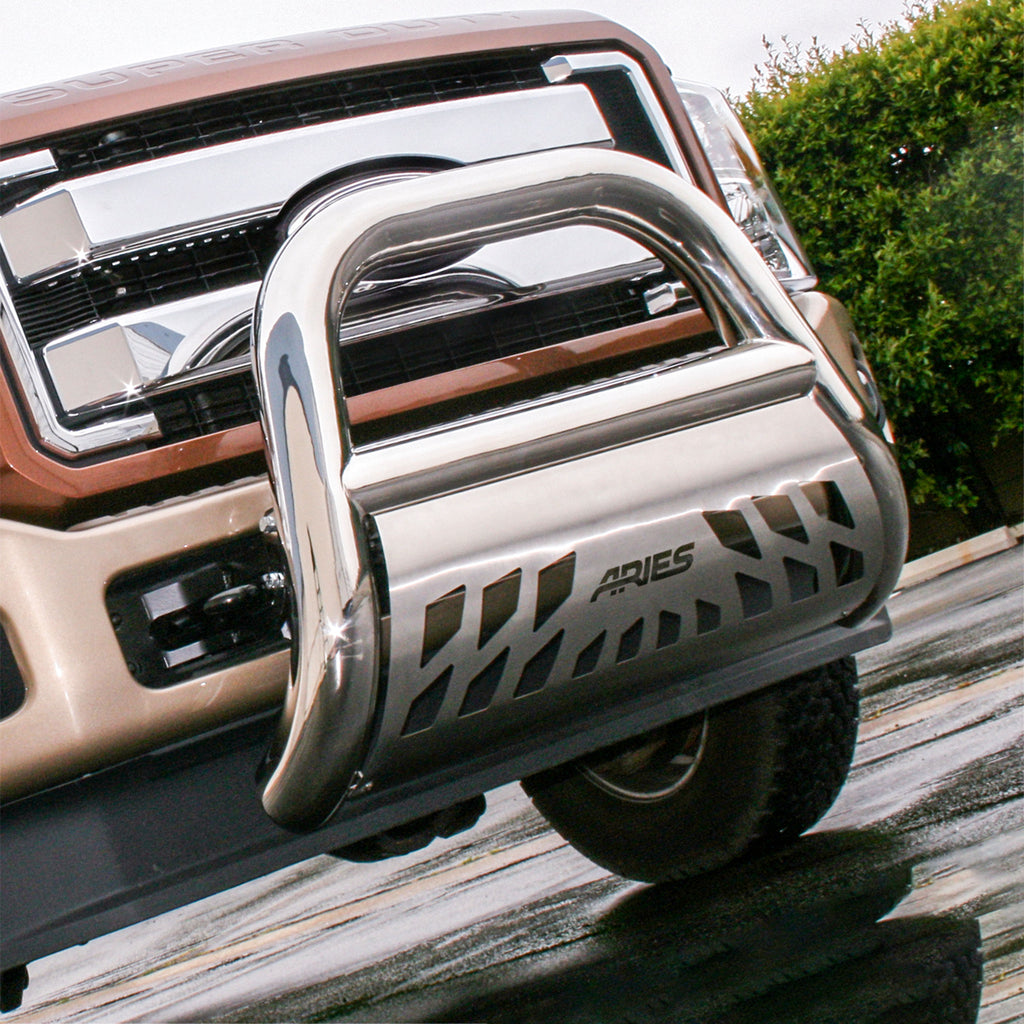 The ARIES Big Horn 4" bull bar boasts a hefty 4" diameter tube to give your truck a bold look with the toughness to back it up. It is constructed from 304 stainless steel to be strong and highly rust-resistant. 304 stainless has a greater nickel content than many other types of stainless steel, allowing it to better withstand water, road salt and rust and maintain a clean surface. It also comes with a mirror-like polished finish for a bright accent on the front end of your vehicle. This bull bar is also available in a textured black powder-coated aluminum construction to give you the freedom to customize the look of your truck. Each Big Horn bull bar offers easy customization options with its pre-drilled light mounting holes. The crossbar features two mounting points to accept an LED light bar or two LED work lights. The bull bar is also equipped with a brushed stainless steel skid plate. The skid plate is made from highly rust-resistant 304 stainless steel and protects against loose gravel and other small road debris. It comes with an aggressive ARIES-exclusive cutout and can also be removed for a customized look. Made to complement our Big Step side bars, the Big Horn bull bar is perfect for lifted trucks, diesels and full-size pickups. Not only does it provide a bold, aggressive look, but it is also made to fit your vehicle perfectly. Each one features a unique bend that accents the shape and contour of a specific front-end application. Our 4" bull bar is also equipped with vehicle-specific mounting brackets. This allows it to be installed quicker, fit better on the vehicle's frame and eliminates the need for drilling. It uses pre-existing factory holes in the frame to cut down on installation time and add rigidity. This bull bar fits select model years of the Ford F-250 Super Duty and F-350 Super Duty (see application info to verify fitment).