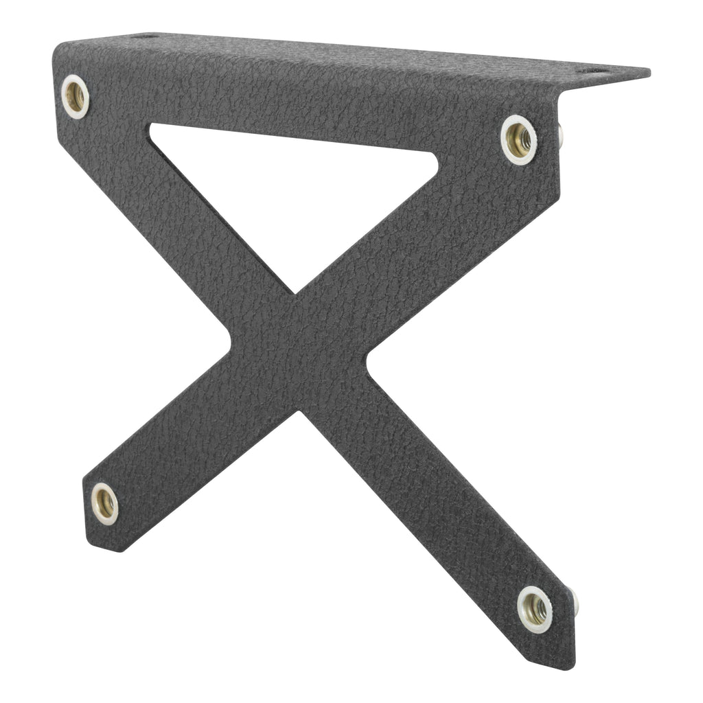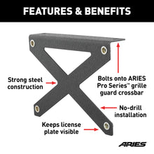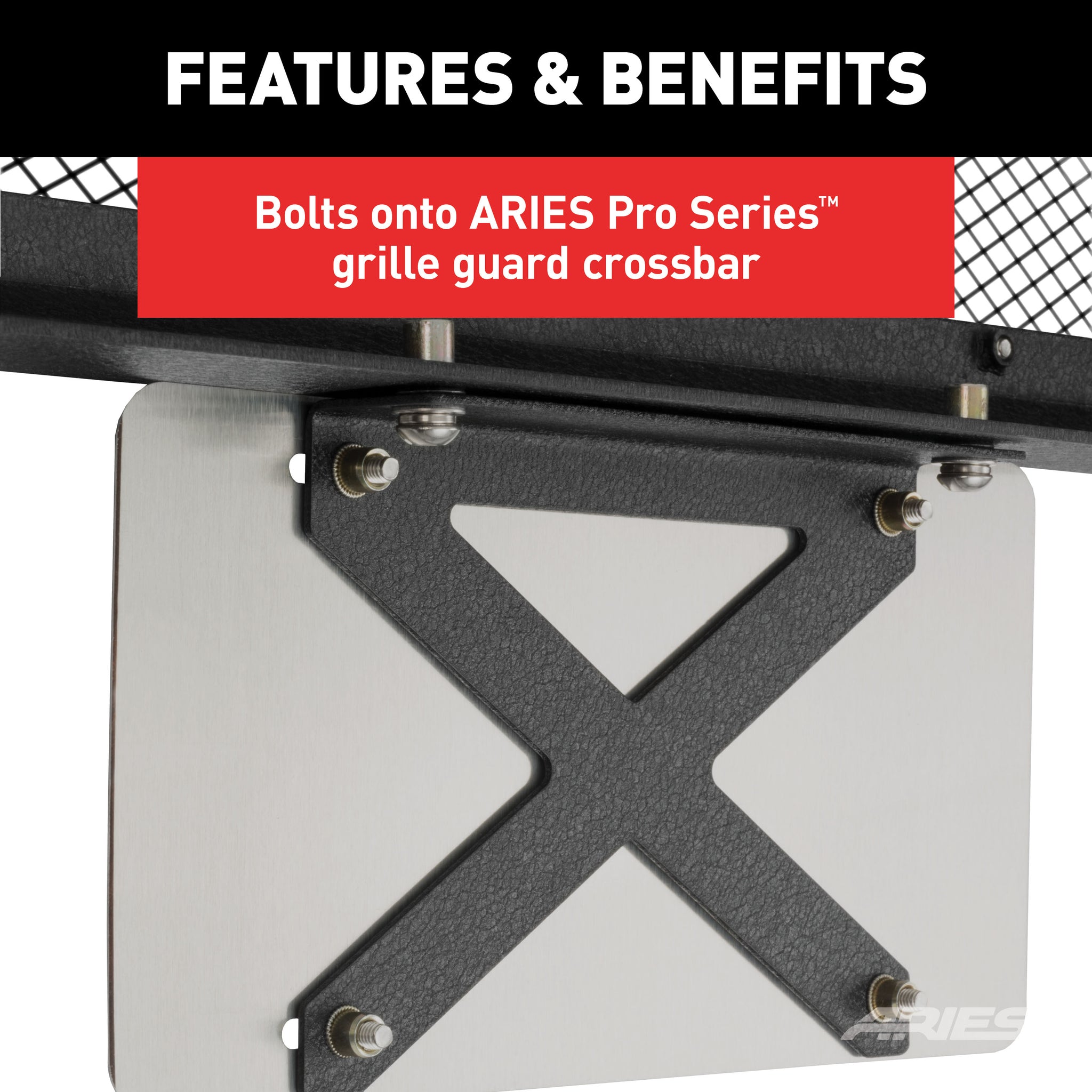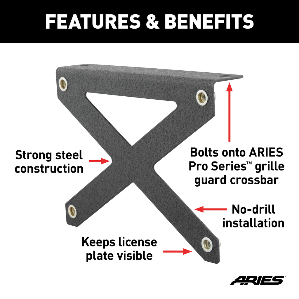 This license plate relocation bracket allows you to reposition your license plate after installing the ARIES Pro Series grille guard. It mounts directly onto the grille guard frame and keeps your license plate secure and clearly visible. The bracket is constructed from strong carbon steel and features a durable black powder coat finish for long-lasting protection against the elements.
