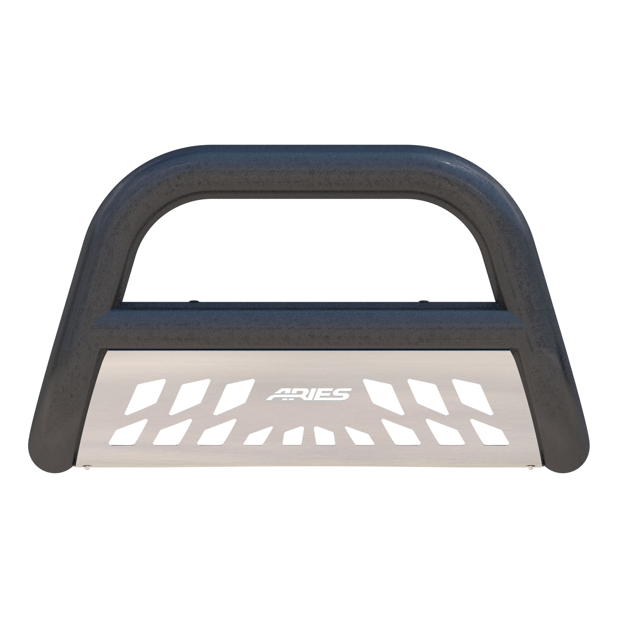 The ARIES Big Horn 4" bull bar boasts a hefty 4" diameter tube to give your truck a bold look with the toughness to back it up. It is constructed from aluminum alloy to be strong, lightweight and rust-free, and it is covered in a highly durable textured black powder coat finish. This tough finish is uniquely designed to hide minor scratches and grime, and it easily resists chipping and peeling. This bull bar is also available in a polished stainless steel finish to give you the freedom to customize the look of your truck. Each Big Horn bull bar offers easy customization options with its pre-drilled light mounting holes. The crossbar features two mounting points to accept an LED light bar or two LED work lights. The bull bar is also equipped with a brushed stainless steel skid plate. The skid plate is made from highly rust-resistant 304 stainless steel and protects against loose gravel and other small road debris. It comes with an aggressive ARIES-exclusive cutout and can also be removed for a customized look. Made to complement our Big Step side bars, the Big Horn bull bar is perfect for lifted trucks, diesels and full-size pickups. Not only does it provide a bold, aggressive look, but it is also made to fit your vehicle perfectly. Each one features a unique bend that accents the shape and contour of a specific front-end application. Our 4" bull bar is also equipped with vehicle-specific mounting brackets. This allows it to be installed quicker, fit better on the vehicle's frame and eliminates the need for drilling. It uses pre-existing factory holes in the frame to cut down on installation time and add rigidity. This bull bar fits select model years of the Toyota Sequoia and Toyota Tundra (see application info to verify fitment).