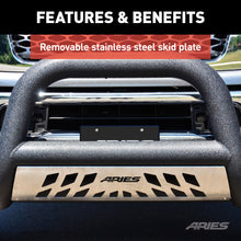 The ARIES Big Horn 4" bull bar boasts a hefty 4" diameter tube to give your truck a bold look with the toughness to back it up. It is constructed from aluminum alloy to be strong, lightweight and rust-free, and it is covered in a highly durable textured black powder coat finish. This tough finish is uniquely designed to hide minor scratches and grime, and it easily resists chipping and peeling. This bull bar is also available in a polished stainless steel finish to give you the freedom to customize the look of your truck. Each Big Horn bull bar offers easy customization options with its pre-drilled light mounting holes. The crossbar features two mounting points to accept an LED light bar or two LED work lights. The bull bar is also equipped with a brushed stainless steel skid plate. The skid plate is made from highly rust-resistant 304 stainless steel and protects against loose gravel and other small road debris. It comes with an aggressive ARIES-exclusive cutout and can also be removed for a customized look. Made to complement our Big Step side bars, the Big Horn bull bar is perfect for lifted trucks, diesels and full-size pickups. Not only does it provide a bold, aggressive look, but it is also made to fit your vehicle perfectly. Each one features a unique bend that accents the shape and contour of a specific front-end application. Our 4" bull bar is also equipped with vehicle-specific mounting brackets. This allows it to be installed quicker, fit better on the vehicle's frame and eliminates the need for drilling. It uses pre-existing factory holes in the frame to cut down on installation time and add rigidity. This bull bar fits select model years of the Chevrolet Silverado 1500, 1500 LD, Suburban, Suburban 1500 or Tahoe and GMC Sierra 1500, 1500 Limited, Yukon or Yukon XL (see application info to verify fitment).