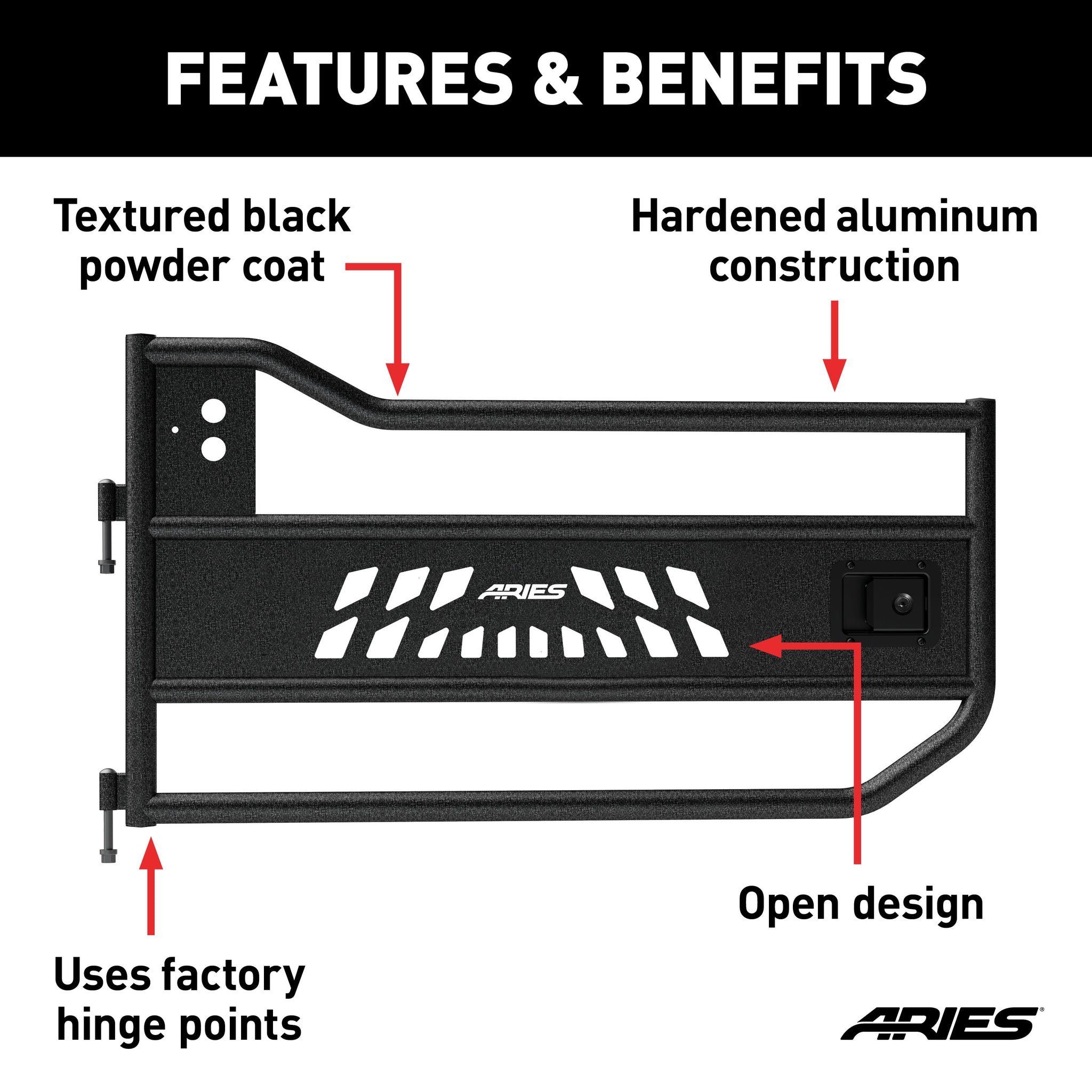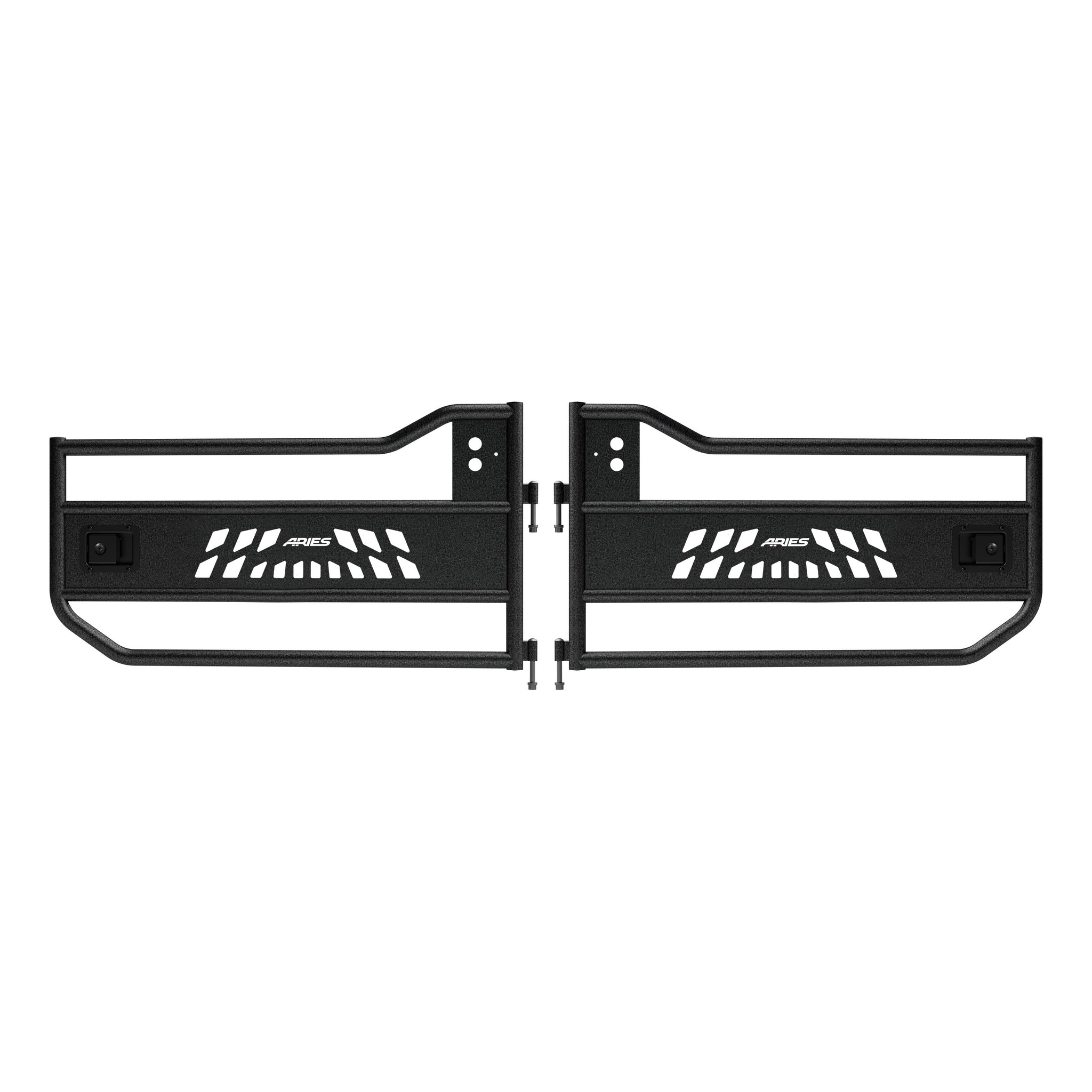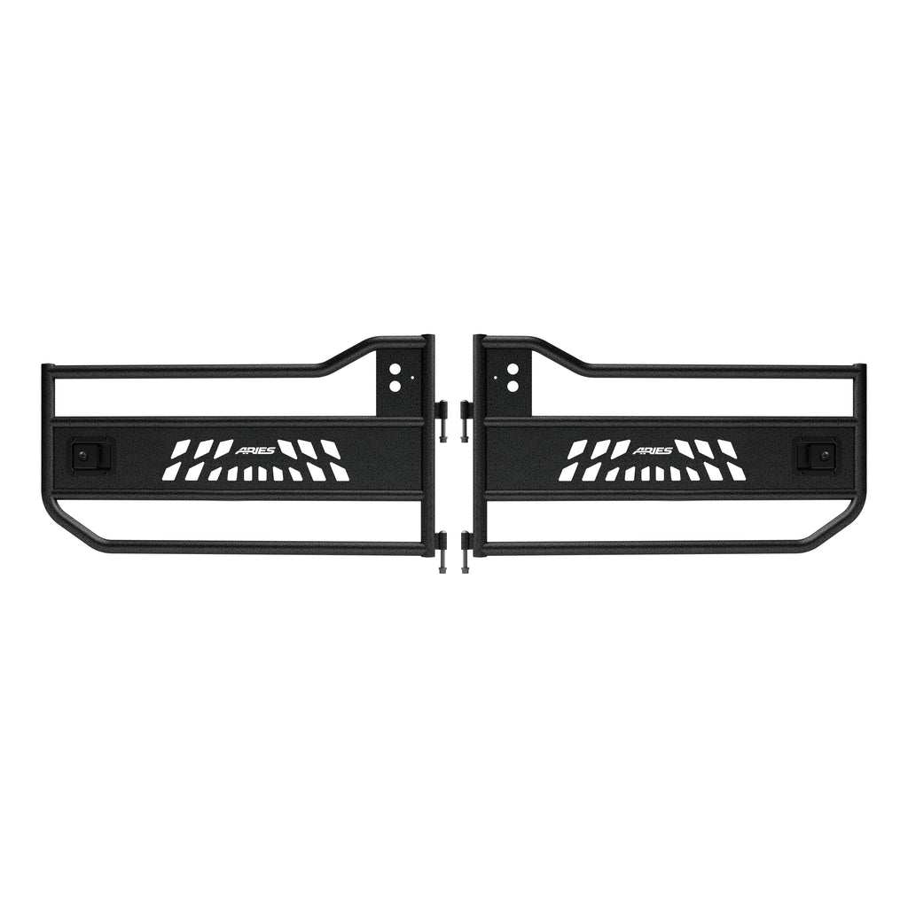 ARIES Jeep tube doors are more than a fancy aftermarket toy for your Wrangler JK; they are the key to turning your ride into the ultimate off-roading machine. Their open-concept design and aggressive cutout pattern makes them the perfect accessory for the desert baja and the rock climber alike. To keep your Jeep JK light on its feet over every sand dune, ARIES Jeep tube doors are built to be lightweight while still maintaining superior strength. They are constructed from T6 aluminum alloy, making them strong but far lighter than steel. We also use 100% TIG welds to ensure a solid build and a precise fit on your vehicle. Jeep tube doors are quick to install and easy to remove whenever necessary, using the factory hinge points. They are coated in a durable black powder coat for maximum corrosion resistance, and the unique textured finish of the powder coat helps hide minor scratches and grime from your off-road excursions (NOTE: Before purchasing ARIES Jeep tube doors, it is recommended that you check local and state laws. Some laws may prohibit the use of this product).