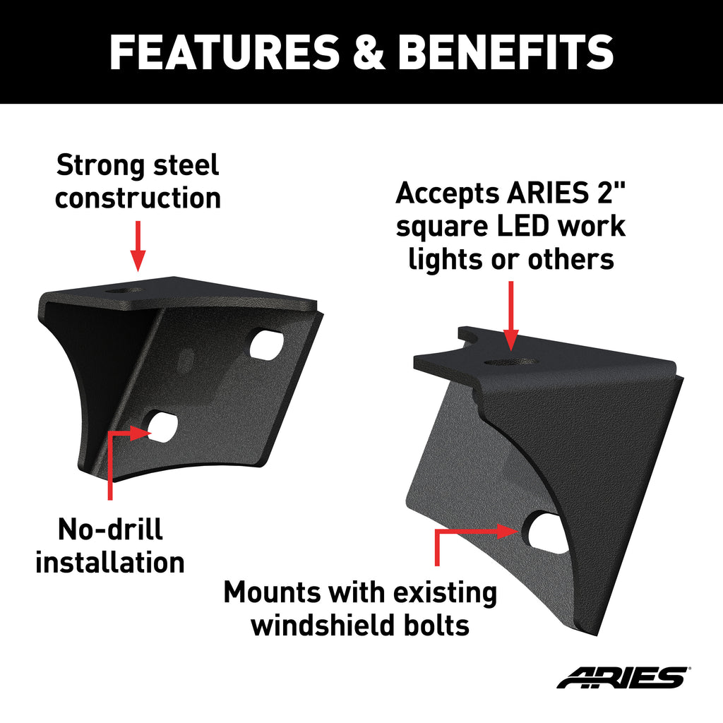 If you know the feeling of your tires treading through sand, the sense of adventure that comes at the start of a new trail or the taste of the open air at the top of a mountain, you know a little of what it feels like to own a Jeep. There is a sense of possibility unlike any other that comes every time you grip the wheel and throw the transmission into drive. Taking your Jeep experience to the next level means outfitting your 4x4 with truck accessories that are built for adventure. ARIES Jeep windshield light brackets easily mount onto your windshield hinges and accept off-road lamps, fog lights, driving lights and more. They feature high-strength carbon steel construction and come with a durable black powder coat finish for lasting protection against the off-road elements.