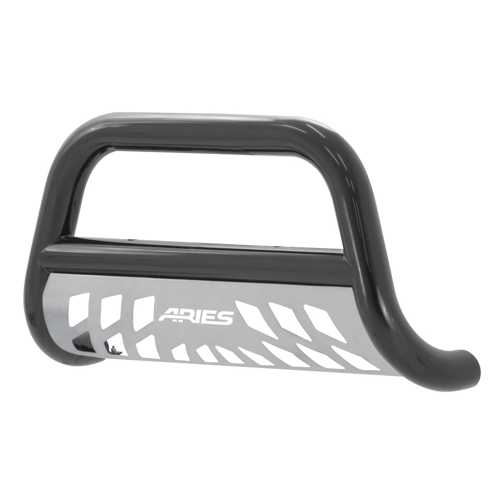 For those who brave the wasteland, it's not easy finding a bull bar that can keep up. Extreme temperatures, moisture and road salt are all waiting to turn your front end into nothing but a pile of rust. For such individuals, the ARIES 3" Stealth bull bar was designed, finished and tested to outlast harsh climates. Unlike most bull bars that come with a black finish, the Stealth bull bar is made with stainless steel instead of carbon steel. A stainless steel construction maintains reliable strength and offers the high rust resistance needed to keep going season after season. To add even more protection against elements, the Stealth bull bar is shielded in a high-gloss black powder coat. This polyester-based finish gives the stainless steel frame a thick skin to further resist rust and changing temperatures. We also put our Stealth bull bars through a rigorous salt spray test to prove this front end accessory can endure whatever the wilderness has in store. With its high resilience to salt and extreme temperatures, the Stealth bull bar provides a reliable black finish option, as an alternative to the polished stainless steel look. All Stealth bull bars are made vehicle-specific for a no-drill, custom fit, and they come with a removable brushed 304 stainless steel skid plate to protect against rocks and other small road debris. ARIES Stealth bull bars also come with two pre-drilled holes in the crossbar to accept round lights up to 5-1/2" in diameter or an LED light bar. It might not be an easy life in the wasteland, but why should that limit your choice of truck accessories? For the black finish option your truck deserves and the quality you expect, choose the ARIES 3" Stealth bull bar. This bull bar fits select model years of the Chevrolet Silverado 2500 HD or 3500 HD and GMC Sierra 2500 HD or 3500 HD (see application info to verify fitment).