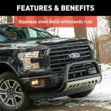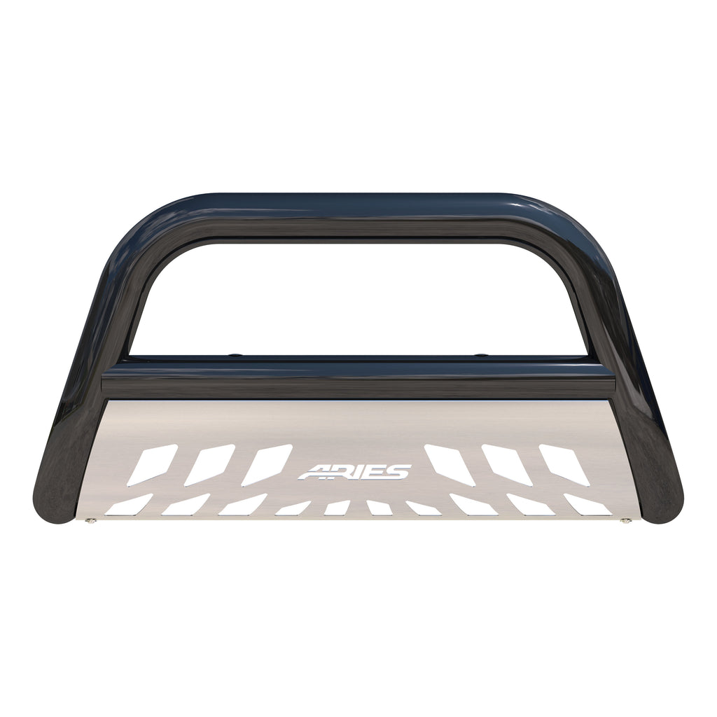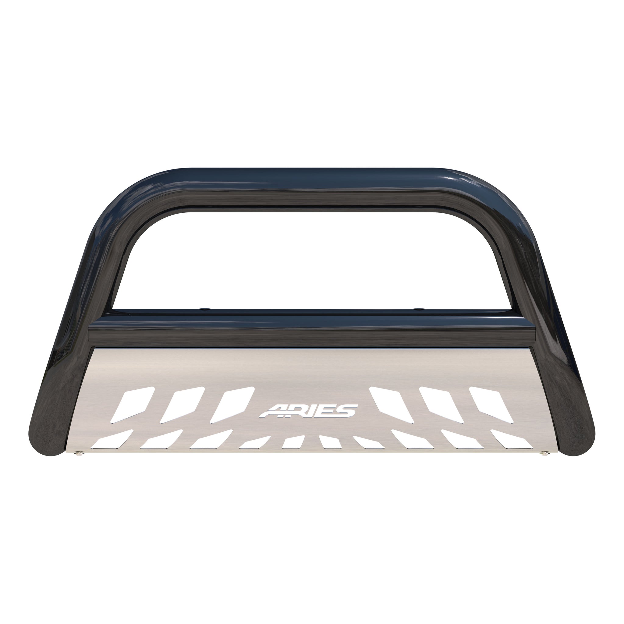 For those who brave the wasteland, it's not easy finding a bull bar that can keep up. Extreme temperatures, moisture and road salt are all waiting to turn your front end into nothing but a pile of rust. For such individuals, the ARIES 3" Stealth bull bar was designed, finished and tested to outlast harsh climates. Unlike most bull bars that come with a black finish, the Stealth bull bar is made with stainless steel instead of carbon steel. A stainless steel construction maintains reliable strength and offers the high rust resistance needed to keep going season after season. To add even more protection against elements, the Stealth bull bar is shielded in a high-gloss black powder coat. This polyester-based finish gives the stainless steel frame a thick skin to further resist rust and changing temperatures. We also put our Stealth bull bars through a rigorous salt spray test to prove this front end accessory can endure whatever the wilderness has in store. With its high resilience to salt and extreme temperatures, the Stealth bull bar provides a reliable black finish option, as an alternative to the polished stainless steel look. All Stealth bull bars are made vehicle-specific for a no-drill, custom fit, and they come with a removable brushed 304 stainless steel skid plate to protect against rocks and other small road debris. ARIES Stealth bull bars also come with two pre-drilled holes in the crossbar to accept round lights up to 5-1/2" in diameter or an LED light bar. It might not be an easy life in the wasteland, but why should that limit your choice of truck accessories? For the black finish option your truck deserves and the quality you expect, choose the ARIES 3" Stealth bull bar. This bull bar fits select model years of the Ram 1500, Ram 1500 Classic and Dodge Ram 1500 (see application info to verify fitment).
