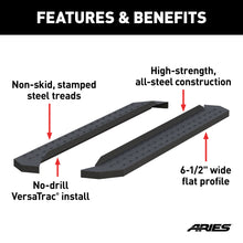 Powerful, definitive and uncompromising as a mountain ridge, ARIES RidgeStep running boards are made for the truck owner who gets it done, day after day. With their solid, all-steel construction, non-skid treads and tough powder coat finish, RidgeStep running boards are made to finish the job. Installation of these running boards is easy and secure because they use the ARIES VersaTrac mounting system. The underside of each board is equipped with a channel that accepts a set of heavy-duty bracket inserts. The inserts move along the channel to fit your vehicle, and the mounting hardware provides a secure attachment. The boards are made in four base lengths, including 53", 75", 85" and 91", and they are designed for vehicle-specific application (NOTE: VersaTrac mounting brackets are sold separately; see the application information to determine which brackets and boards fit your vehicle). ARIES RidgeStep running boards are not only made for easier installation, but they are also built to face the harsh elements of the commercial job. They feature high-strength, solid steel construction for a step that can keep up with those steel-toe boots, and they are completely without plastic parts, meaning they will not crack or fade over time. Their stamped, all-steel tread offers a 6-1/2" wide, non-skid surface that will never wear down no matter how many times you climb in and out of your truck. The end caps are also made from steel and are welded to contour to the body of your vehicle for a professional finish. RidgeStep running boards come with a unique E-coat and textured black powder coat finish to not only withstand rust but also to hide minor scratches and grime. From the cattle ranch of the arid desert plains to the forgotten forest trails of the frozen tundra, the job doesn't wait for those who lag behind. Rise to the challenge and master the job with ARIES RidgeStep running boards.