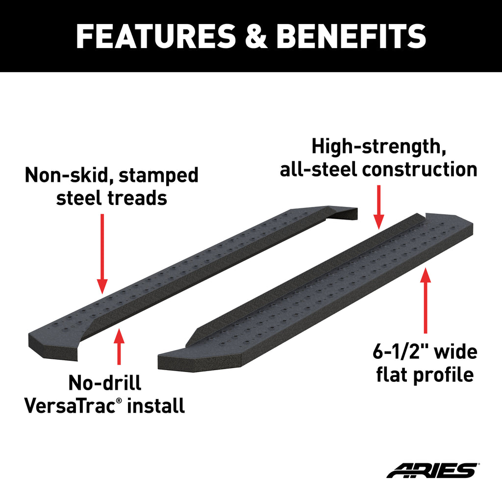Powerful, definitive and uncompromising as a mountain ridge, ARIES RidgeStep running boards are made for the truck owner who gets it done, day after day. With their solid, all-steel construction, non-skid treads and tough powder coat finish, RidgeStep running boards are made to finish the job. Installation of these running boards is easy and secure because they use the ARIES VersaTrac mounting system. The underside of each board is equipped with a channel that accepts a set of heavy-duty bracket inserts. The inserts move along the channel to fit your vehicle, and the mounting hardware provides a secure attachment. The boards are made in four base lengths, including 53", 75", 85" and 91", and they are designed for vehicle-specific application (NOTE: VersaTrac mounting brackets are sold separately; see the application information to determine which brackets and boards fit your vehicle). ARIES RidgeStep running boards are not only made for easier installation, but they are also built to face the harsh elements of the commercial job. They feature high-strength, solid steel construction for a step that can keep up with those steel-toe boots, and they are completely without plastic parts, meaning they will not crack or fade over time. Their stamped, all-steel tread offers a 6-1/2" wide, non-skid surface that will never wear down no matter how many times you climb in and out of your truck. The end caps are also made from steel and are welded to contour to the body of your vehicle for a professional finish. RidgeStep running boards come with a unique E-coat and textured black powder coat finish to not only withstand rust but also to hide minor scratches and grime. From the cattle ranch of the arid desert plains to the forgotten forest trails of the frozen tundra, the job doesn't wait for those who lag behind. Rise to the challenge and master the job with ARIES RidgeStep running boards.