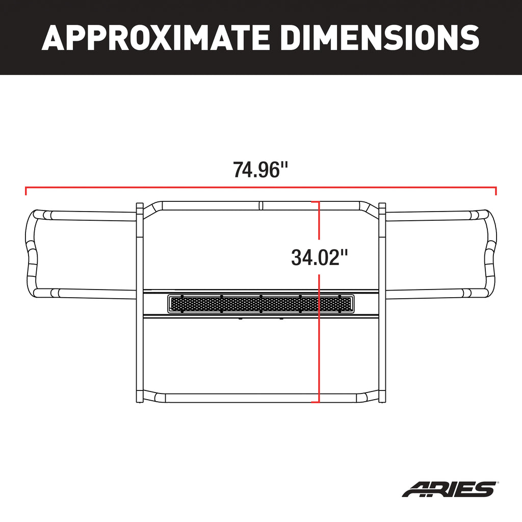 The ARIES Pro Series grille guard is unlike any other grille guard or brush guard on the road today because of its patented center crossbar. The ARIES Pro Series grille guard has a unique center crossbar that is able to house an LED light bar, allowing you to truly set your truck apart from all others. Rather than using a set of light clips or forcing you to drill holes into the frame, the aerodynamic crossbar of the Pro Series grille guard is the light bar housing itself. It uses a 30" slotted channel bracket to accept one or more single-row light bars (light bars not included; some 30" light bars may not fit the channel bracket). The crossbar mount can also articulate, allowing you to position the light beam at any angle you prefer. Integrating the channel mount into the crossbar housing also keeps the light bar protected from the elements. To further stylize your truck, the Pro Series grille guard also comes with an interchangeable grille guard cover plate. Included with each grille guard is a black mesh cover plate that easily bolts on and provides added security for your aftermarket lights. The mesh cover plate can be swapped out with other cover plate options, including five different styles and two finishes. Solid construction should be an essential feature of any grille guard, and the Pro Series grille guard is more than qualified. It has a one-piece design of 1/4" thick welded plates and 1-1/2" mandrel-bent carbon steel tubing. We also finish each Pro Series grille guard in a highly durable, dual-layer E-coat and textured black powder coat, giving it resilience to rust and scratches. This unique finish also helps hide minor scratches and grime to maintain a clean look. ARIES Pro Series grille guards are made vehicle-specific for seamless integration with the factory bumper and an easy, no-drill installation. This grille guard fits select model years of the Toyota Tacoma (see application info to verify fitment).