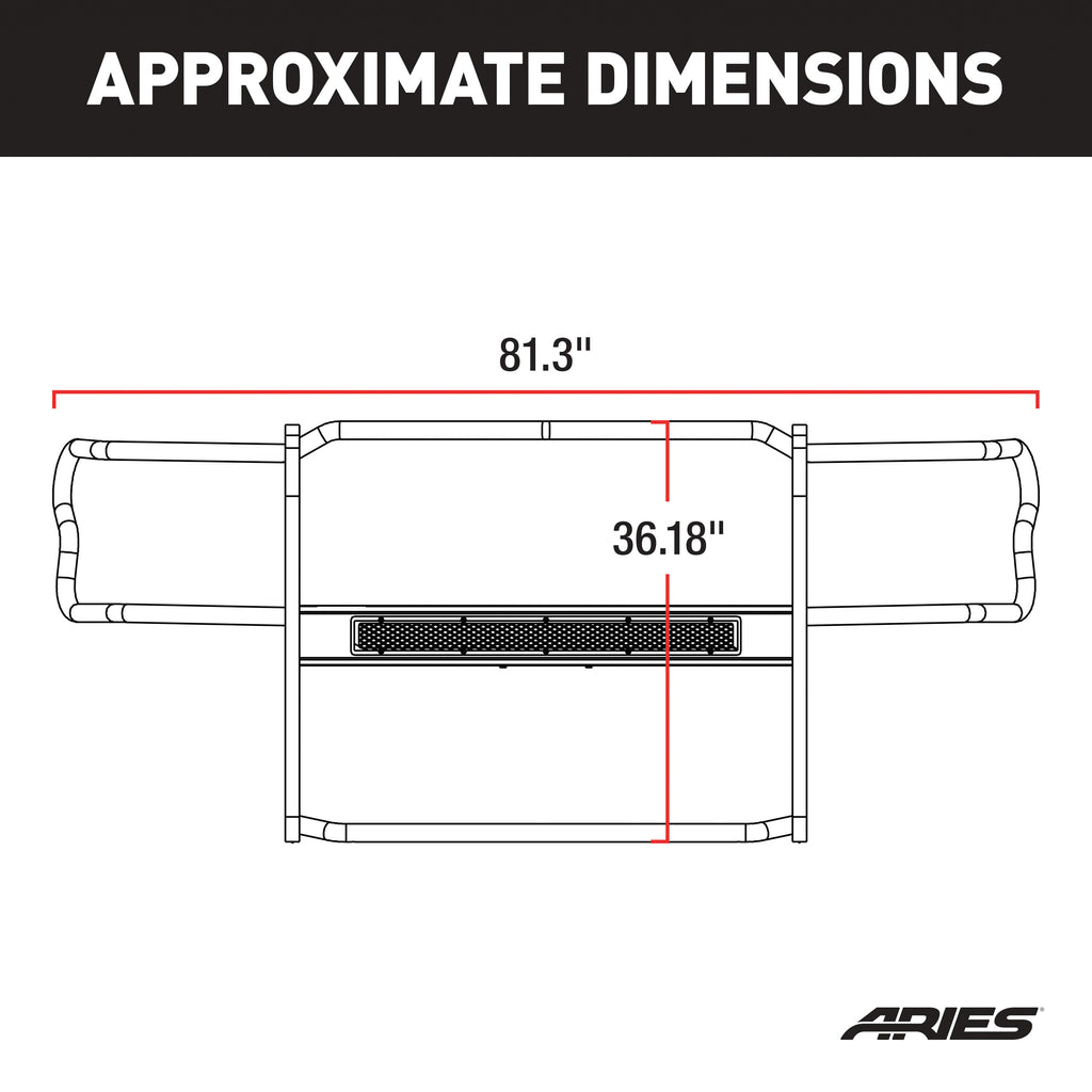 The ARIES Pro Series grille guard is unlike any other grille guard or brush guard on the road today because of its patented center crossbar. The ARIES Pro Series grille guard has a unique center crossbar that is able to house an LED light bar, allowing you to truly set your truck apart from all others. Rather than using a set of light clips or forcing you to drill holes into the frame, the aerodynamic crossbar of the Pro Series grille guard is the light bar housing itself. It uses a 30" slotted channel bracket to accept one or more single-row light bars (light bars not included; some 30" light bars may not fit the channel bracket). The crossbar mount can also articulate, allowing you to position the light beam at any angle you prefer. Integrating the channel mount into the crossbar housing also keeps the light bar protected from the elements. To further stylize your truck, the Pro Series grille guard also comes with an interchangeable grille guard cover plate. Included with each grille guard is a black mesh cover plate that easily bolts on and provides added security for your aftermarket lights. The mesh cover plate can be swapped out with other cover plate options, including five different styles and two finishes. Solid construction should be an essential feature of any grille guard, and the Pro Series grille guard is more than qualified. It has a one-piece design of 1/4" thick welded plates and 1-1/2" mandrel-bent carbon steel tubing. We also finish each Pro Series grille guard in a highly durable, dual-layer E-coat and textured black powder coat, giving it resilience to rust and scratches. This unique finish also helps hide minor scratches and grime to maintain a clean look. ARIES Pro Series grille guards are made vehicle-specific for seamless integration with the factory bumper and an easy, no-drill installation. This grille guard fits select model years of the Chevrolet Silverado 1500 and 1500 LD (see application info to verify fitment).