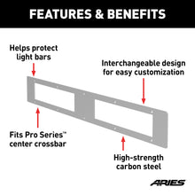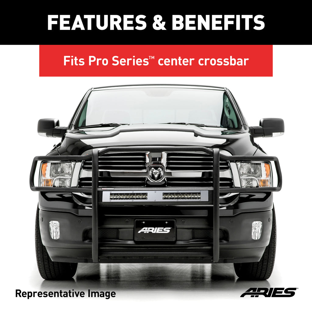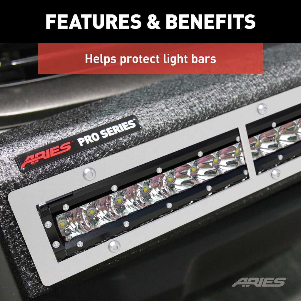 The ARIES Pro Series grille guard is unlike any other grille guard or brush guard on the road today because of its patented center crossbar. The unique crossbar is able to house a single-row LED light bar, allowing you to truly set your truck apart from all others. To further stylize your truck or SUV, the Pro Series grille guard can also accept this interchangeable grille guard cover plate. It easily bolts on and provides added security for your aftermarket lights and a customized look for your front end. We offer a total of eight cover plate options with four different styles and three different finishes to choose from, allowing you to find the look that best complements your vehicle. A black mesh cover plate (#PC30MB) is included standard with each Pro Series grille guard.