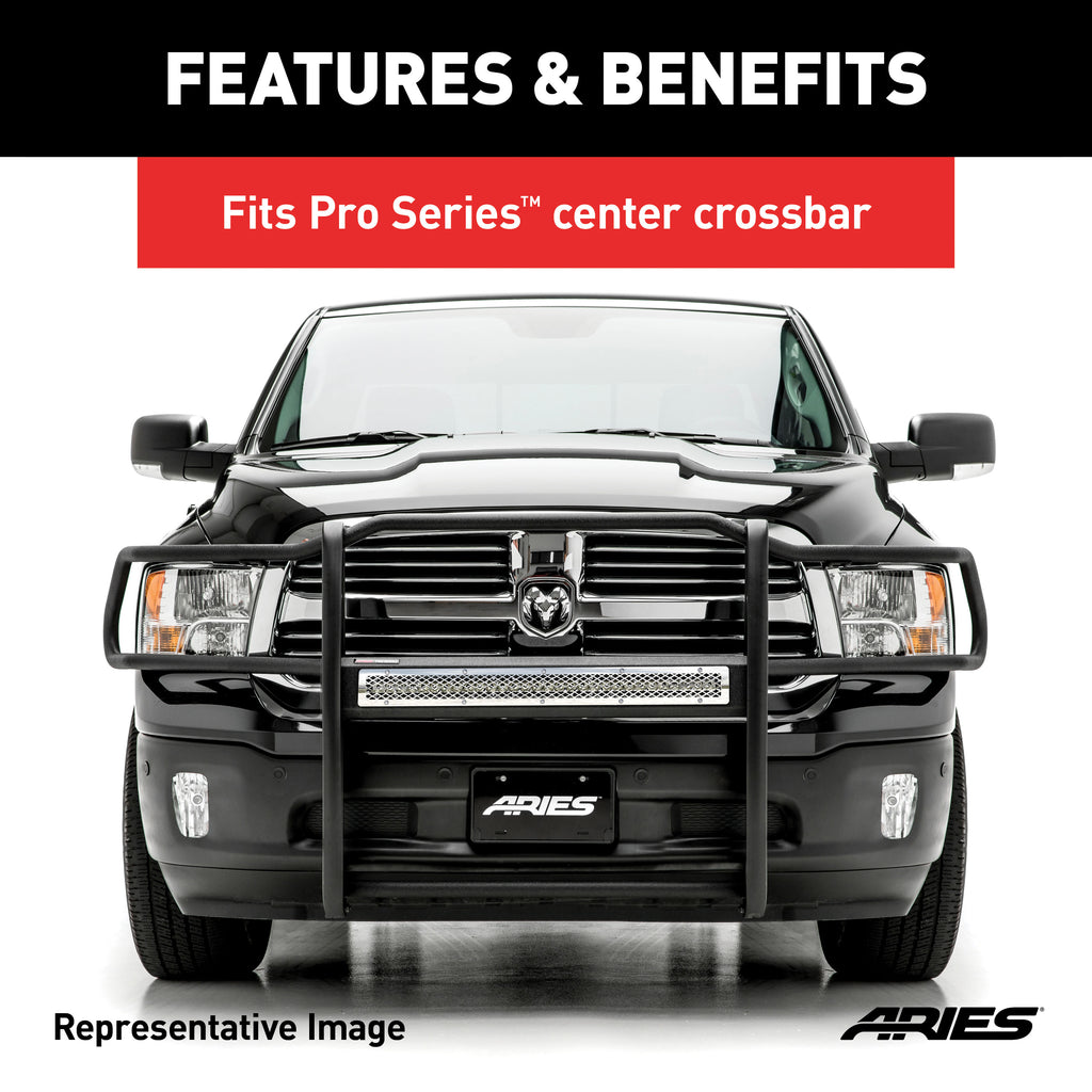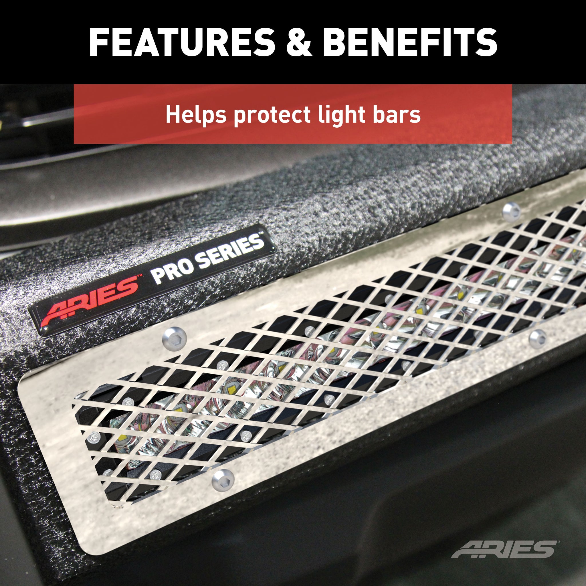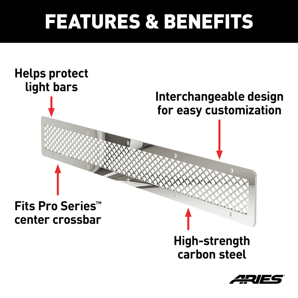 The ARIES Pro Series grille guard is unlike any other grille guard or brush guard on the road today because of its patented center crossbar. The unique crossbar is able to house a single-row LED light bar, allowing you to truly set your truck apart from all others. To further stylize your truck or SUV, the Pro Series grille guard can also accept this interchangeable grille guard cover plate. It easily bolts on and provides added security for your aftermarket lights and a customized look for your front end. We offer a total of eight cover plate options with four different styles and three different finishes to choose from, allowing you to find the look that best complements your vehicle. A black mesh cover plate (#PC30MB) is included standard with each Pro Series grille guard.