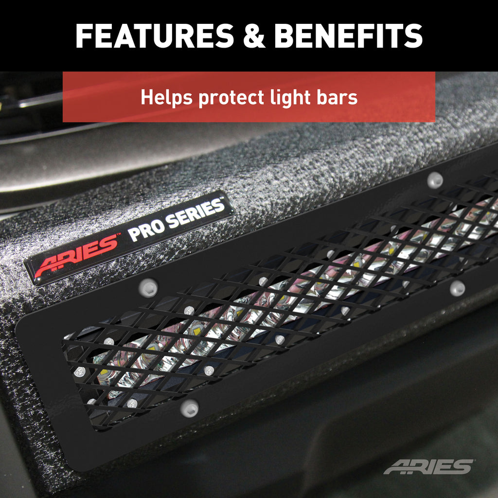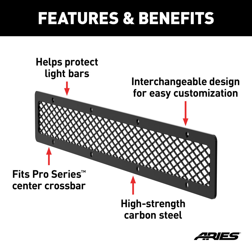 The ARIES Pro Series grille guard is unlike any other grille guard or brush guard on the road today because of its patented center crossbar. The unique crossbar is able to house a single-row LED light bar, allowing you to truly set your 4x4 apart from all others. To further stylize your Jeep Wrangler, the Pro Series grille guard can also accept this interchangeable grille guard cover plate. It easily bolts on and provides added security for your aftermarket lights and a customized look for your front end. We offer a total of four cover plate options for the Jeep Wrangler with two different styles and three different finishes to choose from, allowing you to find the look that best complements your vehicle. This black mesh cover plate (#PJ20MB) is included standard with each Pro Series grille guard.