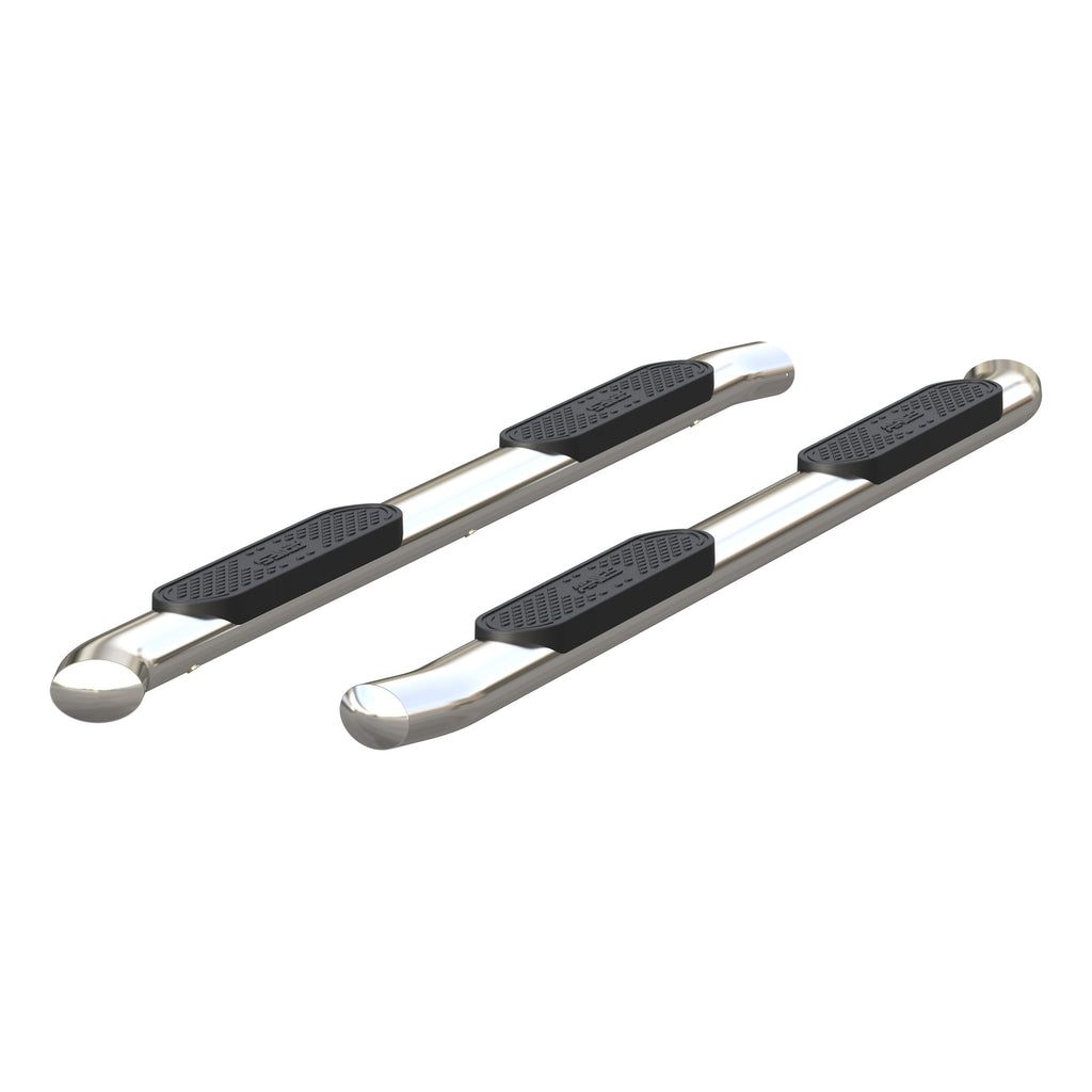When you start and end your day turning the ignition of your truck, unreliable footing just is not an option. You need a step that can bear weight with ease, provide comfortable footing and look good doing it. ARIES 4" oval side bars are sleek, strong and custom-fitted to be a highly functional extension of your truck. For a variety of makes and models, 4" oval sides are a step up. ARIES 4" oval side bars are made with strong 4" elliptical tubing and are available in two different finish options to allow you full customization: polished stainless steel and black powder coat carbon steel. This set of side bars is constructed from 304 stainless steel, meaning high nickel content to be truly stainless. They easily resist rust and corrosion and feature a highly polished finish that is made to last. Something that sets the ARIES 4" oval side bar apart from all others is its blended end caps and OE-style bends. Rather than capping our side bars with a plastic cap, we offer a blended end cap for a smooth, finished appearance. We also equip the ends with a special 20-degree bend and original equipment styling to perfectly contour to your vehicle. ARIES 4" oval side bars are fitted with raised step pads to provide a wide stepping surface. The polypropylene construction will not crack over time, and because it has a textured grip, the surface is highly resistant to slips and skids, even when wet. Installation of ARIES 4" oval side bars is quick and easy with custom-fitted mounting brackets and no drilling necessary.